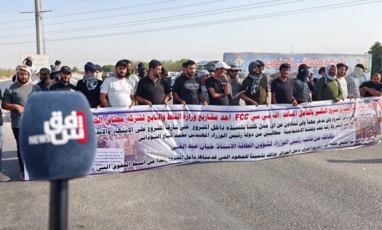 البصرة.. العاملون في مشروع FCC يجددون تظاهراتهم أمام بوابة مصافي الجنوب