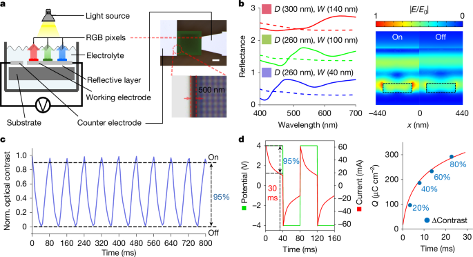Figure 3b illustrates the measured normalized reflectance modulation of RGB metapixels in the on and off states. As both Mie scattering and grating modes are influenced by variations in the refractive index of the surrounding environment, the optimized nanodisk dimensions for the RGB metapixels are: R (D = 300 nm, W = 140 nm), G (D = 260 nm, W = 100 nm) and B (D = 260 nm, W = 40 nm). A clear distinction is observed when comparing the metapixel reflectance in air with that in electrolytes. Specifically, the reflectance in electrolytes is notably higher, whereas scattering in the red-light region is significantly suppressed. This effect arises because Mie scattering depends on the relative refractive index (m=frac{{n}_{{rm{particle}}}}{{n}_{{rm{env}}}}), where nparticle and nenv are the refractive index of the WO3 nanodisks and the surrounding environment, respectively. When nparticle is close to nenv, the scattering is markedly reduced, making the material seem more transparent and desaturated in colour. Therefore, the colour contrast of WO3 metapixels in electrolytes is less saturated than in air; however, despite the ultra-thin WO3 nanodisks (~100 nm), the optical contrast remains at ~50%, significantly outperforming most planar WO3 electrochromic devices with the same thickness30. This enhancement is due to the high refractive index of WO3, concentrating the electric field of incident light in the nanodisks. After switching to the dark state, most of the incident light is absorbed, as confirmed by numerical simulations of red subpixel on and off states (Fig. 3b, right). The on–off switching of RGB pixels enables high-contrast modulation, which is essential for reflective display applications with full colour coverage.
