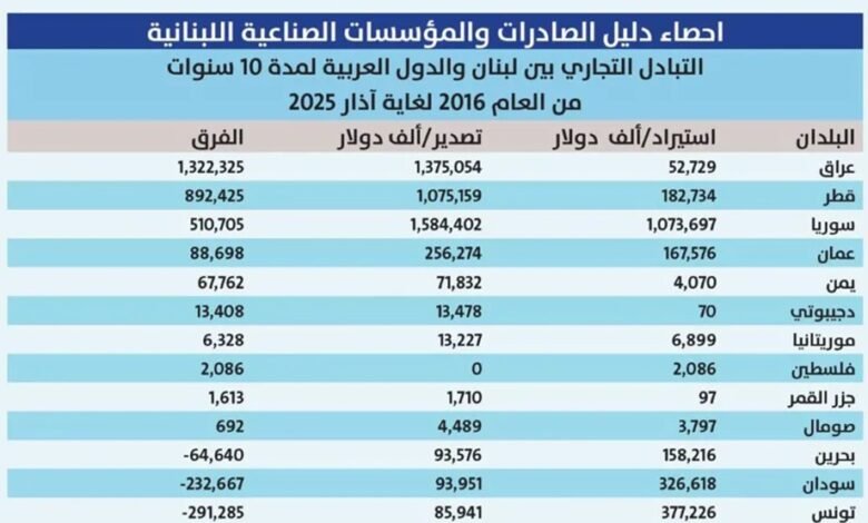 وبالأرقام، تشير الإحصاءات إلى أن سوريا احتلت المرتبة الأولى في الاستيراد من لبنان بين عامي 2016 وآذار/مارس 2025، إذ بلغت الصادرات إليها ما قيمته نحو مليار و584 مليون دولار، فيما استورد لبنان منها بنحو مليار دولار، بينما جاء العراق في المرتبة الثانية من حيث الكميات، لكنها الأولى من حيث الأرباح. فقد صدّر لبنان إلى العراق في الفترة عينها ما قيمته مليار و375 مليون دولار، في حين استورد لبنان منه ما يقارب الـ 52 مليون دولار فقط