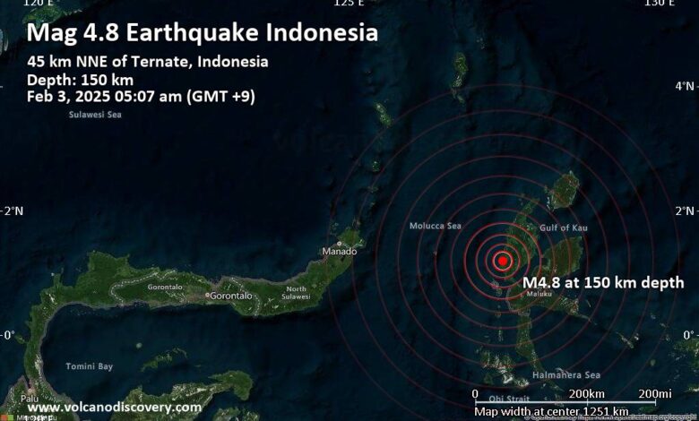 حجم معتدل 4.8 زلزال يضرب 46 كم شمال تيرنيت ، إندونيسيا في الصباح الباكر