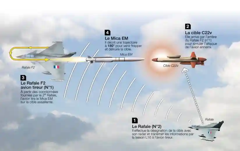 واحدة من أبرز القدرات التي تتمتع بها الرافال هي إمكانية إصابة أهداف تقع خلفها أثناء الطيران، وهي ميزة نادرة وغير مألوفة في عالم القتال الجوي. يتم ذلك باستخدام صاروخ MICA-EM الموجه بالرادار النشط، حيث يمكن للطائرة إطلاق الصاروخ على هدف يطاردها من الخلف، فيُرشد الصاروخ نحو الهدف عبر بيانات تصل من طائرة رافال ثانية تضيء الهدف برادارها وتشارك الإحداثيات عبر وصلة البيانات المشتركة. هذه التقنية توفر قدرة دفاعية هجومية غير مسبوقة، إذ تمنح الطيار القدرة على التعامل مع تهديدات من الزوايا الميتة دون الحاجة للقيام بمناورات خطيرة.